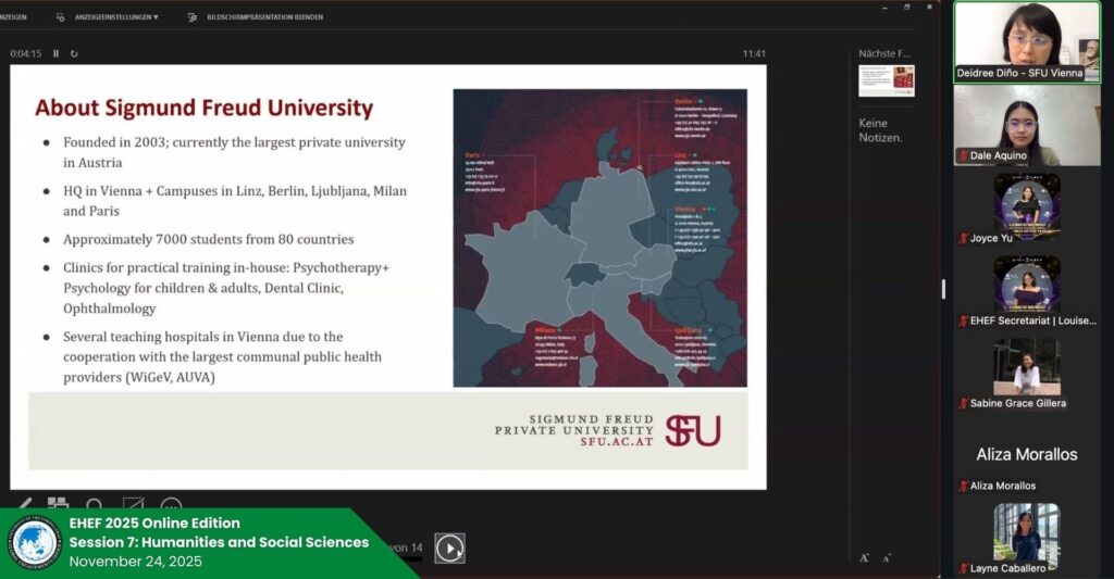 Ms. Dino presented an overview of SFU’s academic offerings in psychology, psychotherapy, and the broader social sciences, emphasizing the university’s clinical and research-centered approach to mental health education. She also outlined scholarship options, financial support mechanisms, admission procedures, and student life in Austria, giving participants a comprehensive look at what to expect when pursuing studies in Europe. The session concluded with a Q&A segment, where attendees raised questions about requirements, tuition fees, and the application process.